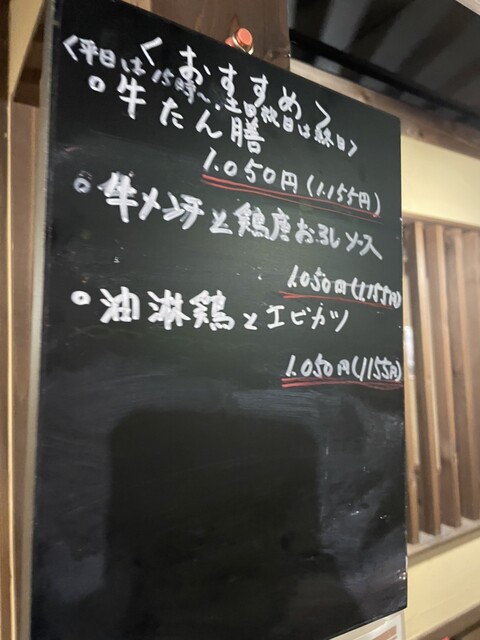 柱にあるおすすめメニューから、自分は牛メンチと鳥唐おろしソース1,155円、連れは油淋鶏とエビカツ1,155円、娘はハンバーグ。わんこは馬肉のミートローフ328円。飲み物は樽生ワイン。娘がご馳走してくれると言うので、カラフェ1,848円をドーンと注文。