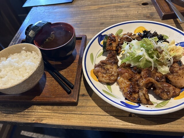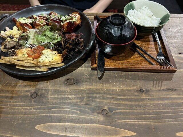 連れの油淋鶏とエビカツ到着。ご飯とお味噌汁とワンプレートです。中華ですが、プレートにはヒジキの煮物などの和風。