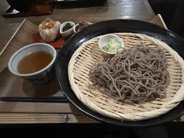 蕎麦は手打ち風。おにぎりと小鉢が付いています。