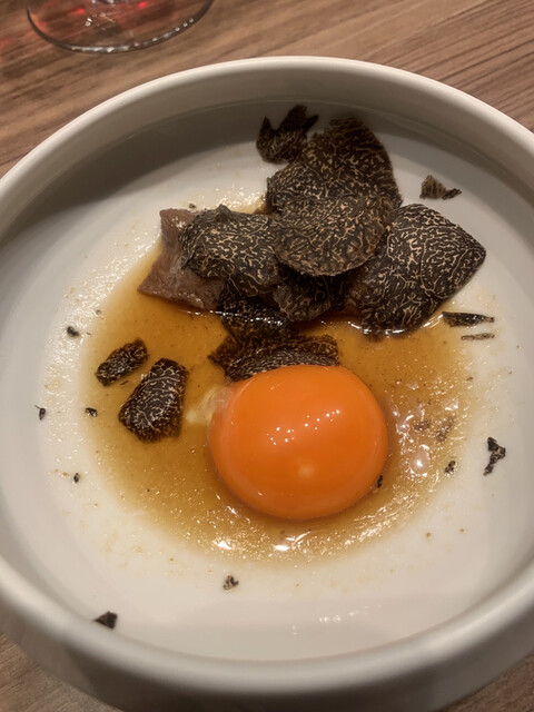 黒トリュフを贅沢に使用し、徳島県「あわそだち」の卵に絡めてすき焼き風で お召上がり頂きます