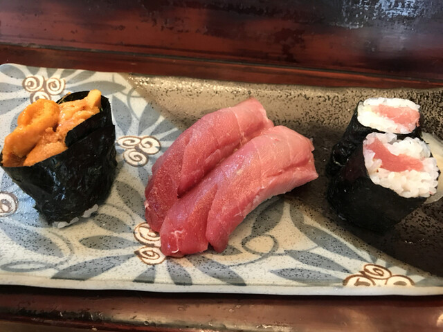 毎回来る度に定番のネタと旬のネタも入れてくださり、鮑有りの早くもホタルイカ有りで旨すぎて、目を閉じて悶絶します。白身も旨く、海老の炙り具合も抜群です。口中に旨味が広がります。巻き物も有りで、締めには中トロと大トロでとどめを刺されます。大満足です。昨今の値上げの中でほぼ値段も変わらず、いつも良い素材で提供してくれます。