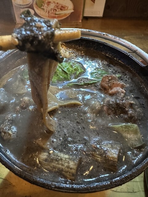 胡麻ダレの入ったつけ鍋が来まして、目の前でグツグツと煮えたてます、煮えた頃に丁度良く殻ごと引かれた太めの平打ち十割蕎麦がお目見えです…