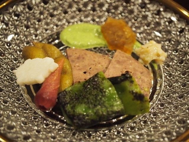 1. イノシシのテリーヌ、万願寺唐辛子(山椒のソース)