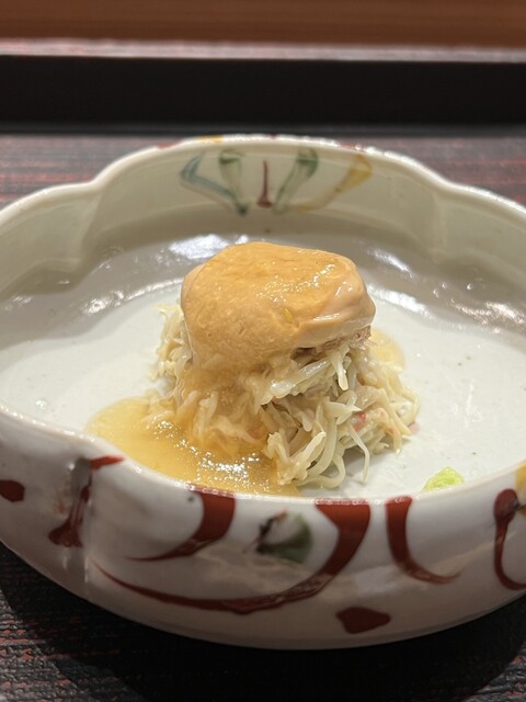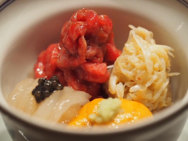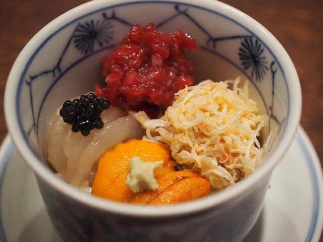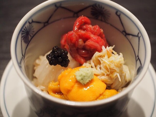 赤身、毛蟹、根室の馬糞雲丹、富山の白海老紹興酒漬けの上にオセトラキャビア