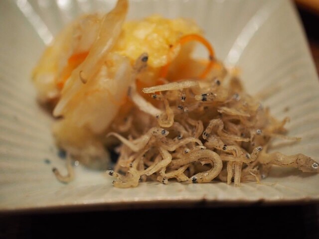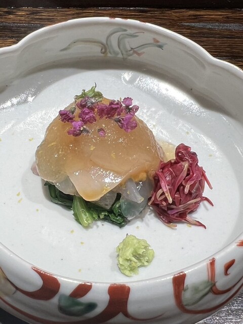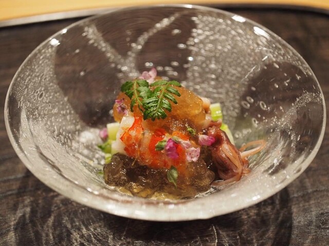 天然の蛍烏賊、天草の車海老 上から牛のコンソメのジュレをかけて