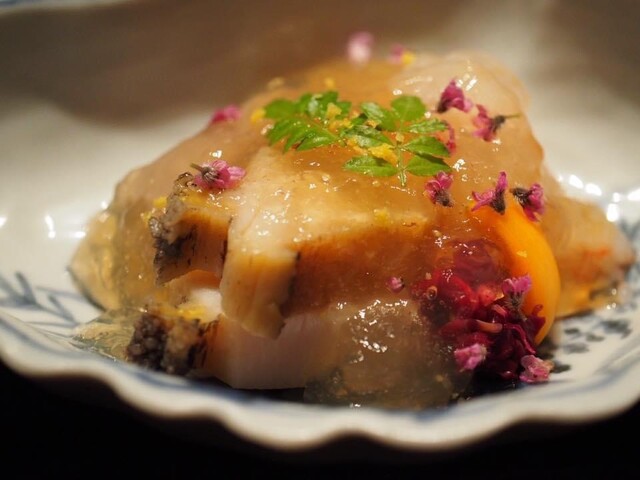 5. 牛出汁ジュレ 牡丹海老 アワビ酒蒸し セイコガニ