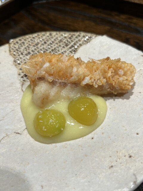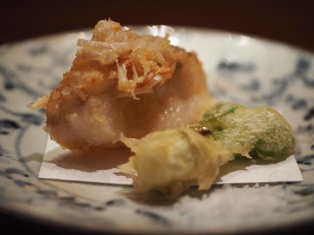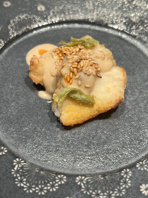 ②あいなめ天ぷら 自家製ラー油、胡麻ソース 蕗の薹
