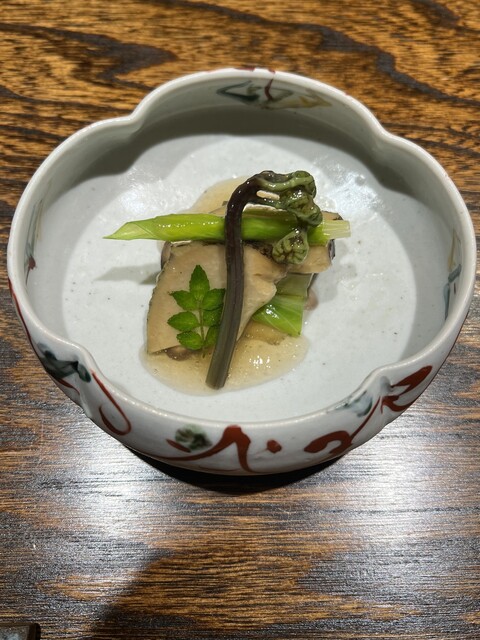 ① 煮鮑、肝、蕨、うるい山菜お浸し