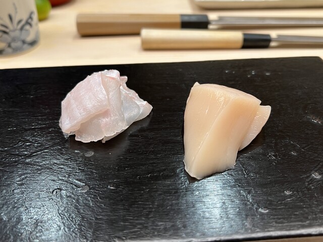 青森ダイセンの紫ウニと愛媛赤ウニ食べ比べて 最高! 夏旬の白身魚 今回マナガツオ、白川甘鯛と真鯛,全て食感、味が違う. 魚によって丁寧な仕込みと熟成した 色々な風味が絶妙. もちろん レジェンド漁師藤本純一から魚の品質最高!江戸時代から続く鮨屋の夏の符丁新子, 3枚握る皮目は柔らかいし 優しい香り付け シャリとバランスが良く. 美しくて贅沢な夏風味!