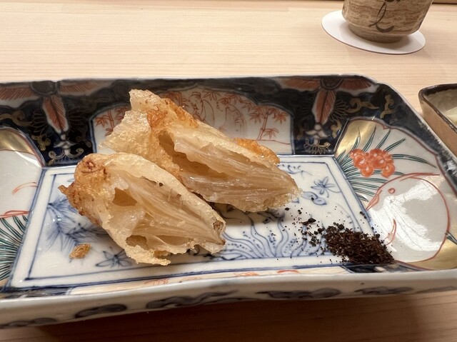 定番フカヒレの天ぷら, 今回松茸とあんかけ加えて 海の珍味と山のキング松茸, 旨みたっぷり出汁のあんかけ,3つ要素が完璧なバランスを形成し、五感で楽しむことができます. 最初松茸の香り、バリバリフカヒレ食感、とろみのあるあんかけで美味しく頂きました.
