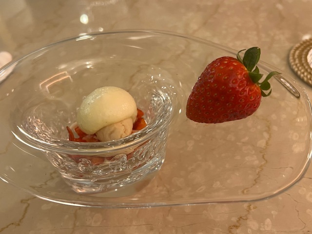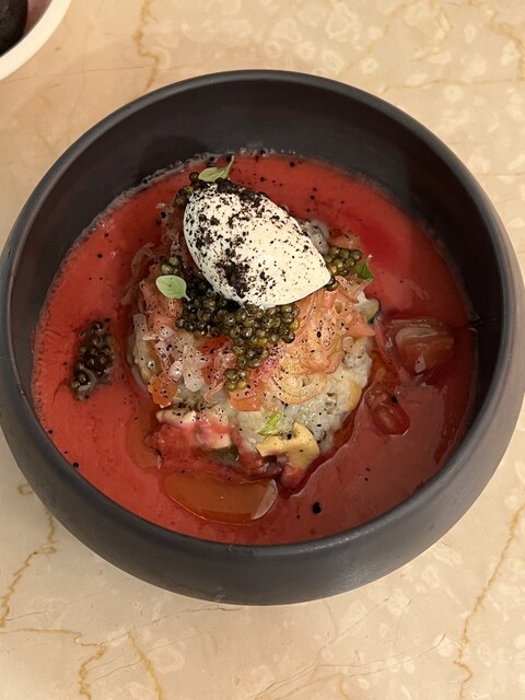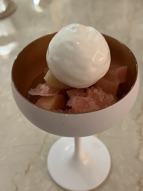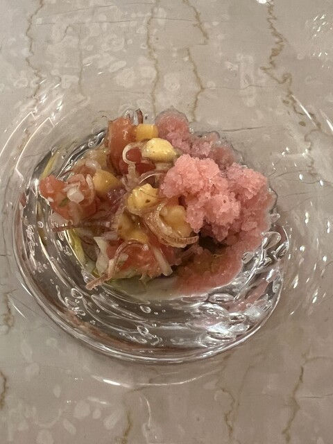 今回のメニューもすごかった!最初から最後まで全て美味しい. マグロタルタルはマグロをフルーティのソルベに合わせる さっぱり味は別格です.