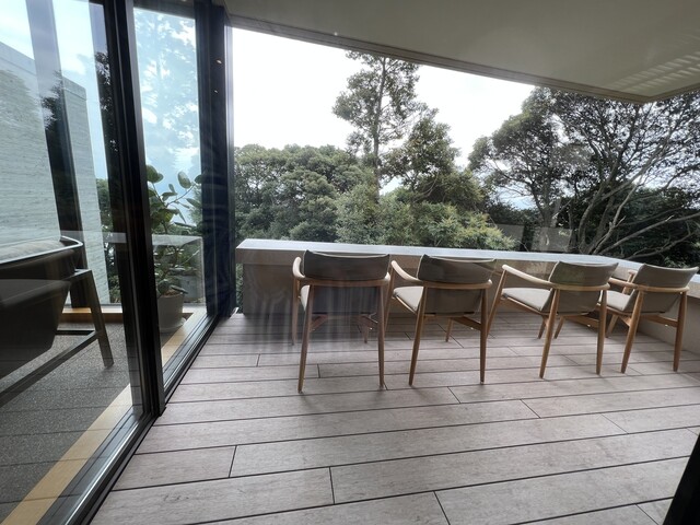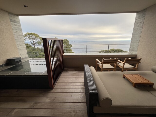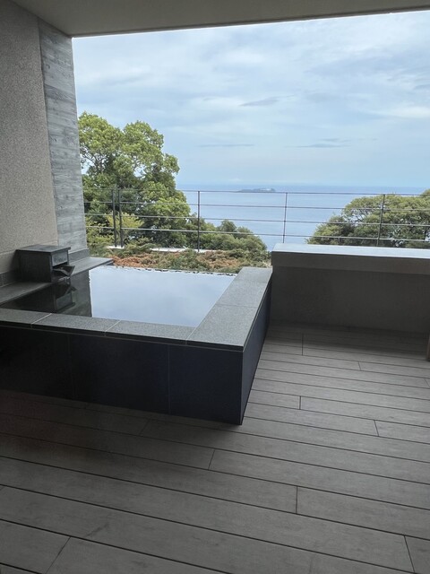 ① 広大な相模湾のパノラマと緑溢れる大自然の景色が一望でき天然温泉露天風呂を備えた. 部屋からは海と初島に眺められ、心からリラックスできます。
