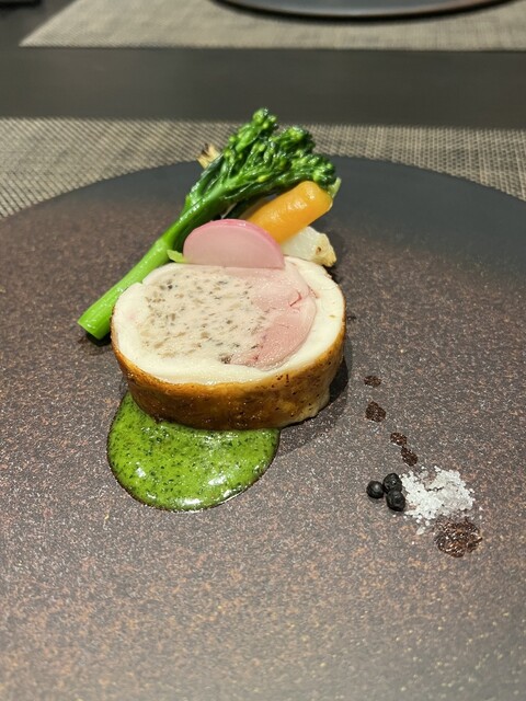 ⑦天城軍鶏のガランティーヌ、三島西麓野菜杉正農園ヤマメ蕪、姫人參、スティックセニョール、南仏カマルグのお塩、台湾胡椒