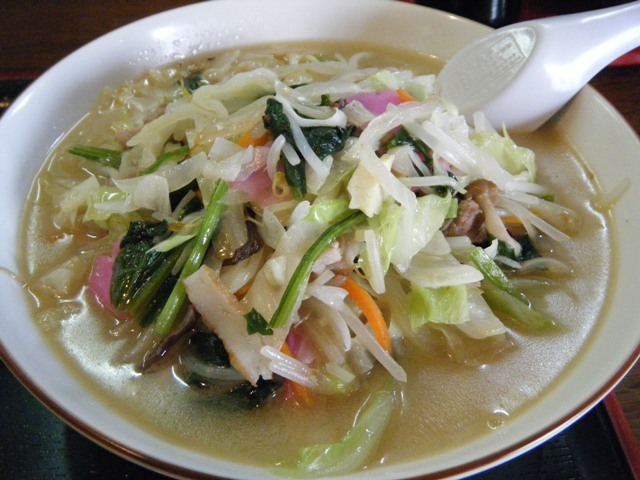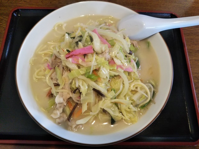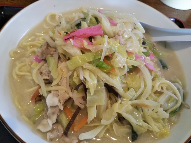 無性にここの”ちゃんぽん”が食べたくなり再訪。今回は”ぎょうざ(5個)”をつけて注文しました。”ぎょうざ”は皮は薄めですがもっちり感があるもの・・好みの野菜たっぷりの軽めのぎょうざなので美味しくいただきました。久しぶりに食べたちゃんぽんの感想は・・前回と比べるとスープに違いがありました。やや旨みが少ないかと・・具材などを見ながら味わっているうちにここのちゃんぽんは看板でも謳っているとおり”地場産野菜がたっぷり”なので野菜の旨みに影響されやすいのではと思いました。9月は時期的にも野菜が少ない時期であり、おまけに今年は台風や大雨の影響で野菜の安定仕入れが大変だと思います。美味しい野菜の旨みがちゃんぽんスープには欠かせないもの・・晩秋以降にまた食べてみようと思います!!