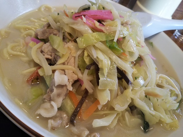 10分ほどで運ばれてきたのは・・いつもに比べ直径で1.5倍ほどあるどんぶりに盛られたちゃんぽん!地場産野菜に拘ってきた当店・・今日の具材は豚肉、キャベツ、にんじん、たまねぎ、木耳、青菜、もやし、そしてしめじが入っているようです。
