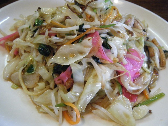 前回食べた"ちゃんぽん"がとても美味しかったので"皿うどん"を食べるために再訪しました。ここの皿うどんは"太麺やきそば風"と"あんかけ細麺"の2種類があり、今回は"太麺やきそば風"を注文。運ばれてきたものを見ると・・ちゃんぽんと同様、新鮮な野菜類とピンクの長崎はんぺんのコントラストがとても綺麗!名前にあるように全然とろみをつけず文字通り”やきそば風”に仕立てられています。よく見ると野菜やかまぼこ類など小さめに切り揃えられており、それが心地よい食感につながっているのだろうなと改めて思いました。味は・・ちゃんぽんが超美味だったのだから当然この皿うどんもとても美味しかったです。お勧めです!!