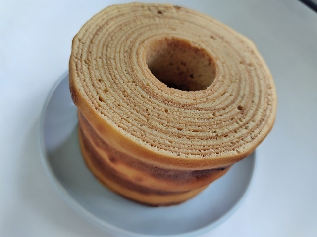 福岡市の沖合い、玄界灘に浮かぶ"壱岐"の石田町湯岳地区・・田んぼが広がる自然豊かな当地区に2022年6月オープンしたスイーツ店。シンプル・ピュア・ナチュラルをモットーにバウムクーヘンをメインとしたお菓子、パンを提供しており、今回は柔らかタイプとしっかりタイプの2種類あるバームクーヘンの中、しっかりタイプの"壱岐の輪ごころ(年輪)"を食べてみました。直径10センチ×高さ7センチの一品です。