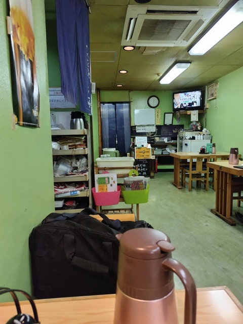 ここは地元ブログを見ていて気になった店。レンガ調の永田ビル1階にあり暖簾のかかる入口からは中が見えませんが、入口にあるメニュー看板が入りやすさを助長しています。店内は緑色の壁で奥に長い造り・・右側に四人掛けテーブル席が4つ、左側手前に2人掛けテーブル席が2つ、その奥に小上がりの四人掛け席が2つ並んでおり、アットホームな雰囲気を醸し出しています。