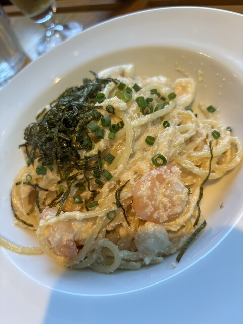 明太子パスタは、プリプリのエビとイカ、ベビーホタテがたくさん入っていてそこに明太子の塩気がたまらない。