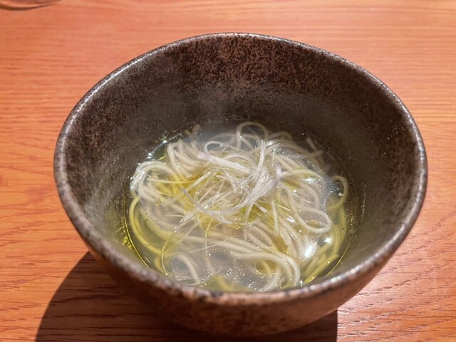 すっかりここんちの味のトリコになってしまい、嫁と再々度の訪問。すっかり秋も深まるどころか朝は真冬のような寒さになり、「味覚の秋」をすっ飛ばし「食材の冬」の到来を感じる1日の始まりでした。今日はどんなおいしいものがでるのかワクワクしながら入店。結論から先に言うと、夫婦揃って大満足のメニュー構成でした。前菜のサバの焼き物、しっかりと醗酵液につかり、熟成された身が干物ともフレンチとも言えない、なんとも複雑な味で混ざりあう。嫁も同じタイミングで「美味しいっ」と目があってしまった。次はパスタ。大好きなショートパスタ。厚みのある椎茸。大好きなチーズのソース、カチョエペペ「チーズと、胡椒のソース」。ラグー味もしっかり効いていてかなりアルデンテ。一緒にきたフォカッチャでソースも全部拭き取りました。きのこのパスタはこの時期いろんな店で出しているが、すごく良い組み合わせと感心しました。椎茸の弾力とパスタの弾力がシンクロした逸品。魚は氷見のさわら。旬ではあるが難しい魚というイメージ。しかしながら上に乗った大根の千枚漬け風ピクルスの酸味のパンチがすべてを払拭してくれました。ハーブの香りとピクルスの酸味がさわらの淡白さをうまくカバーしていました。大根ピクルスはかなり強烈な酸味だったが全て計算された味でした。大山鳥の焼き物は皮のクリスピー感とお肉の柔らかさの落差で感動。「前日に扇風機で皮の水分を飛ばしてから焼き目を付けるとこう言う食感になるんです」との説明。ひと手間もふた手間もかけて準備するとやっぱり料理は美味しくなりますよ!と聞こえる回答でした。シメのシラスゴハンも和歌山の穫れたてのシラスをすぐ釜茹でした、これも未だかつて味わったことのないような食感のシラス。牡蠣醬油と新米でいだだきました。特別ではない食材でも特別な料理になる。再認識させられる料理でした。本当に美味しかった。また次の予約を入れて帰りました。ご馳走様でした!