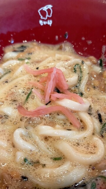 ほんのり温かいうどんに具はこだわり卵と海苔、おかか、ネギ、揚げ玉、それに納豆。