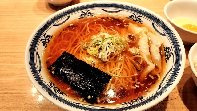スッキリ濃いめの醤油スープに麺量多めの細麺、ネギ、海苔、生姜風味濃いめなワンタンが5粒。