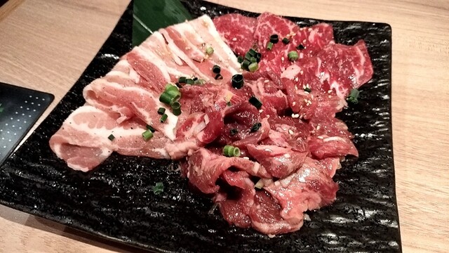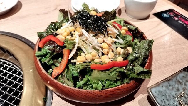 キムチ、ナムルの他、スープ、塩、タレ焼肉盛合せやホルモン2種盛合せ等の全8品