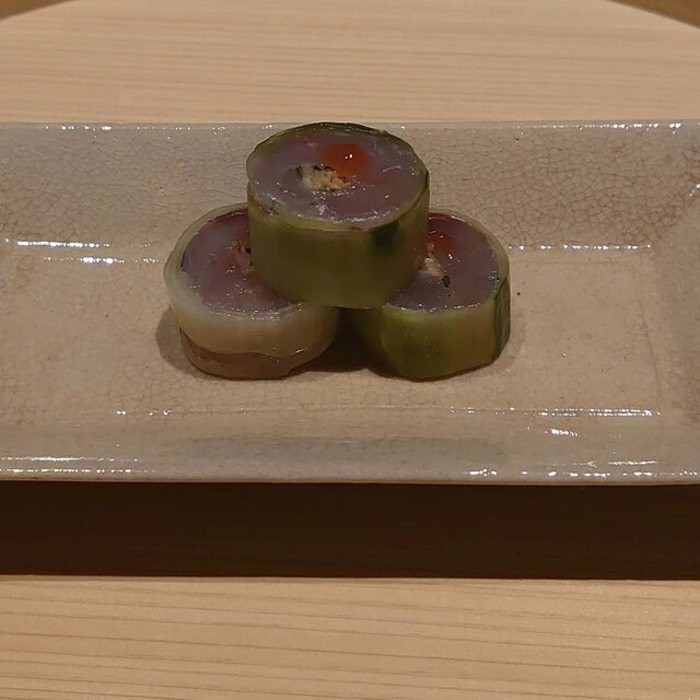 鯵の砧巻き、大根の酢漬けに胡麻、葱、米麹、生姜添え