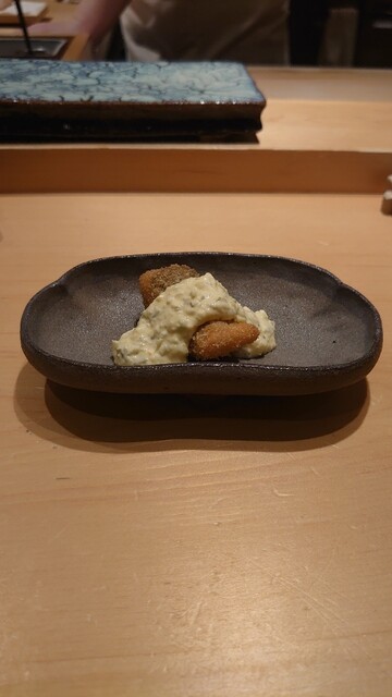 皮剥の塩揉み、虎河豚の白子と皮剥の肝を裏漉し、追い舎利