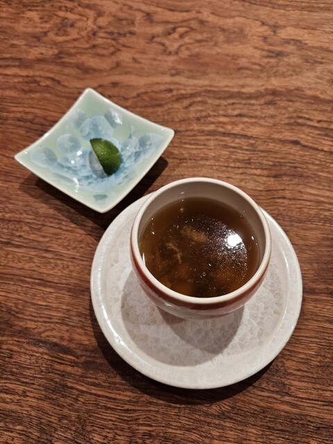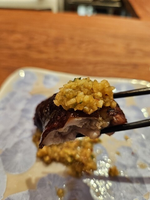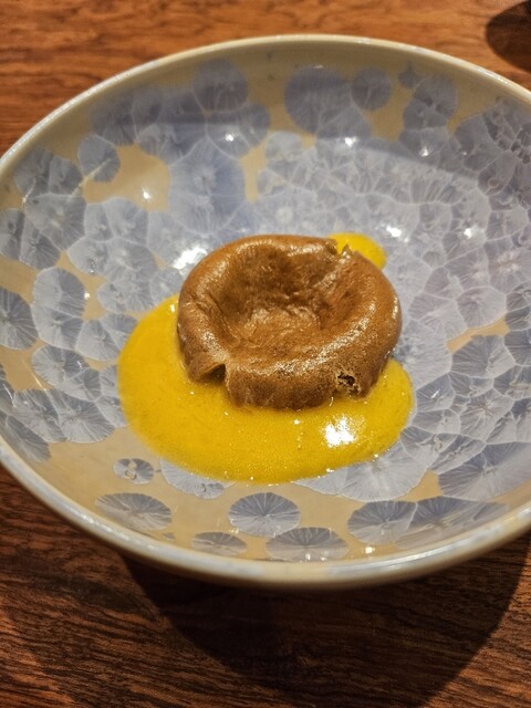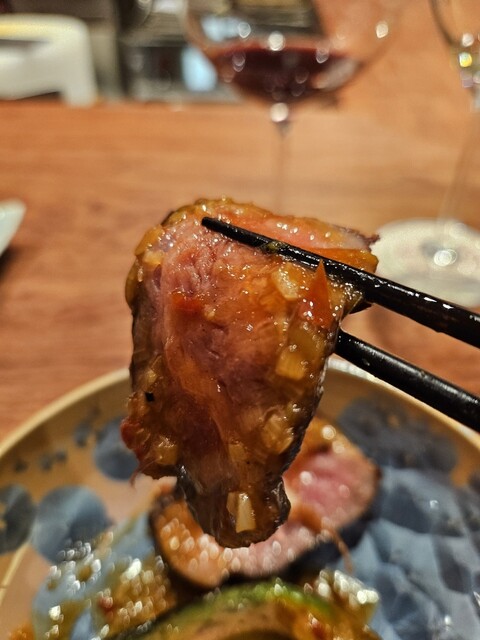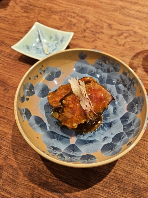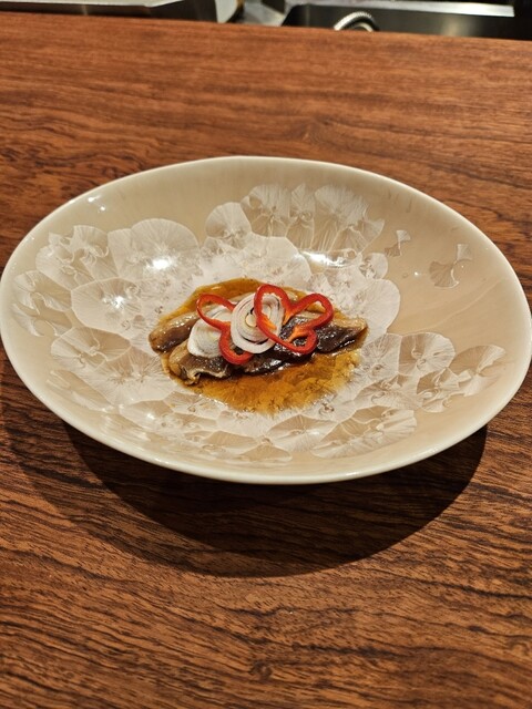 津村の河内鴨を大阪の土居さんのこだわりの昆布で昆布締めした後に、薄切りにし片面だけ炙って紹興酒漬けにしたものなんだそうです。鴨と昆布のダブルの旨味を堪能出来ました!!