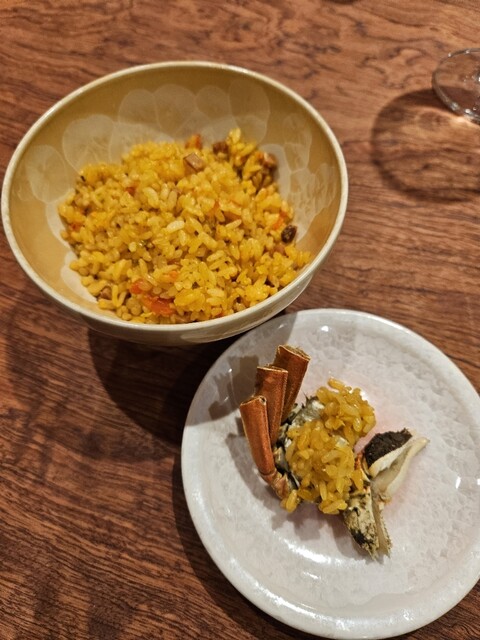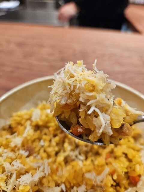 チャーハンは、蟹の味噌から出た美しい黄金色!!干し豚も入っていました。