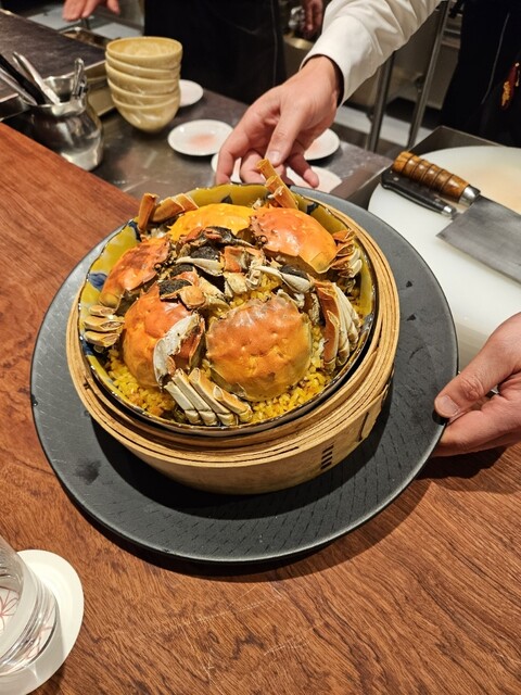 これがこの日の一番の見せ場!!シェフがハスの葉で包んだものを開くと…蒸籠には上海蟹がドドンとのったチャーハン!!