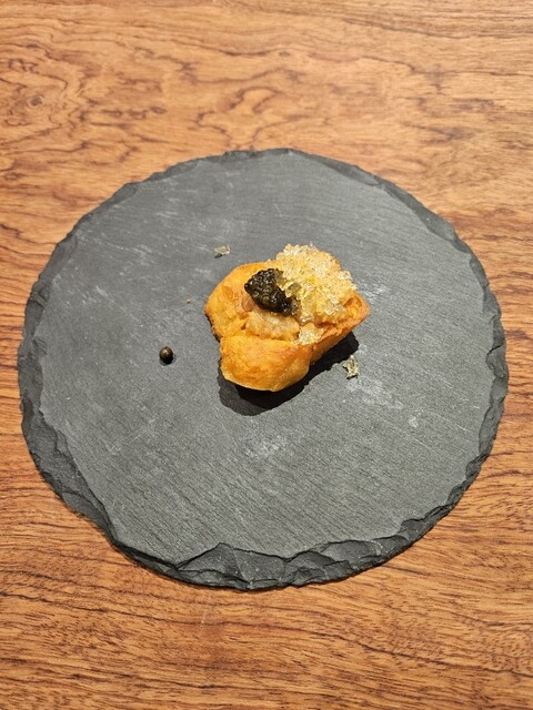 油条(ユウジョウ)というパンに、腐乳と雲丹を染み込ませてカリッと焼き、黄金ピータンをのせたものなんだそうです。