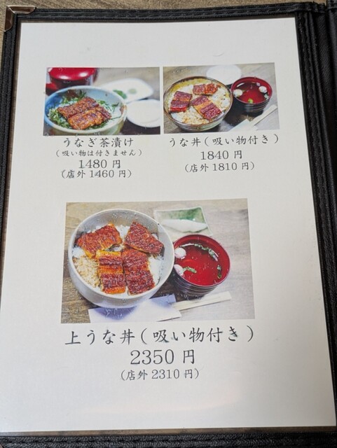 メニュー(うなぎ茶漬け、うな丼、上うな丼)