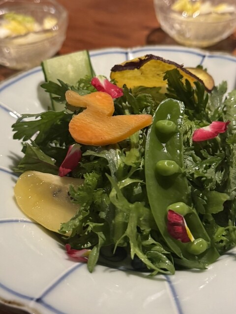 途中の箸休めのサラダや、〆の前の野菜串(芽キャベツなど)も季節感があり楽しめました。ちょうちん苦手だな、と言っていた友人も「これなら食べれる!」という驚きの食べ方。