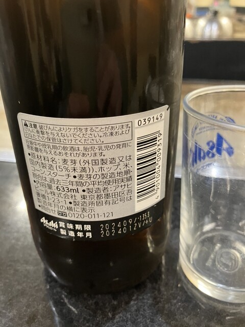 マンボ焼きのソバでトッピングフルコンボ、お供は大人の義務教育アサヒの633で。