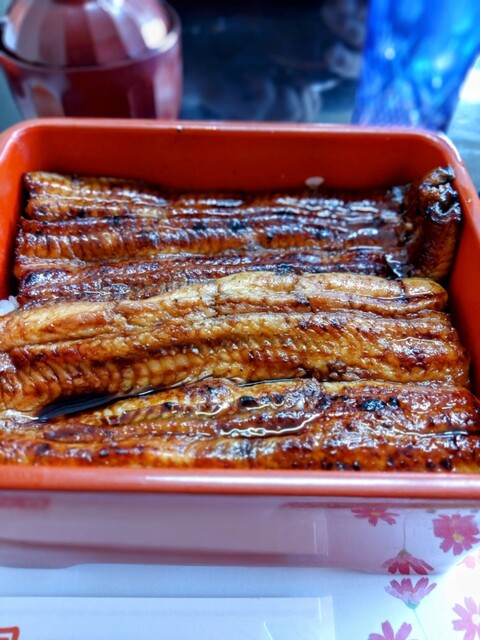 御重を開けると1匹半のうなぎ蒲焼が折り畳まれてぎゅうぎゅうに乗っています。