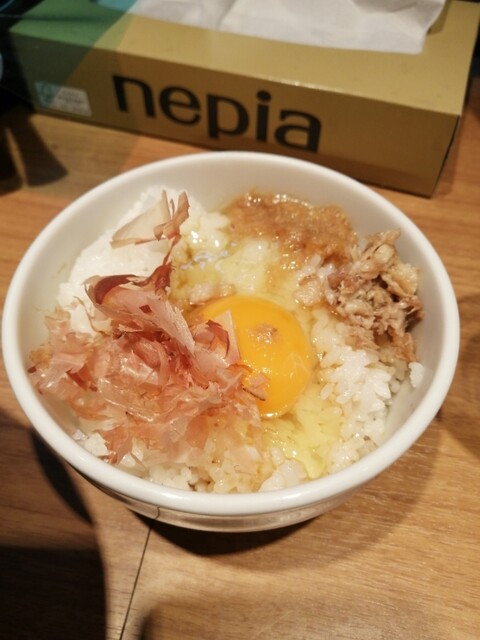 麺を食べきると卵かけご飯へ着手。鰹節と味噌と卵をませまぜして準備完了、最高の卵かけご飯。