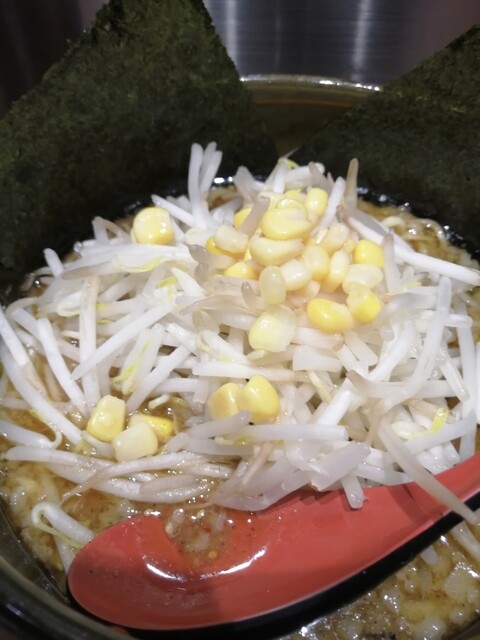 数分で到着した丼は、縁に海苔2枚ともやしにコーンという超シンプルな姿。カウンター上の紙エプロンを装着してもやしからいただきます。よく熱が通っていて味噌ラーメンの全体的に熱い仕上がりを出鼻からくらう。