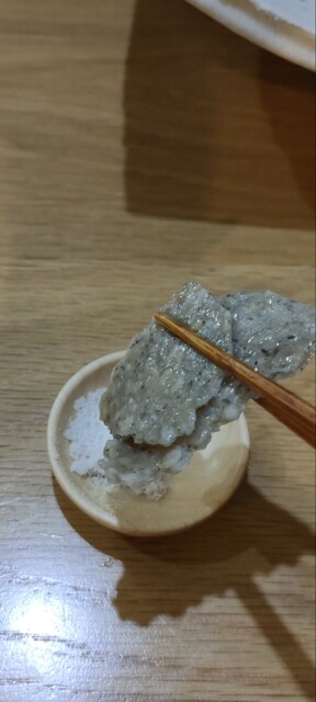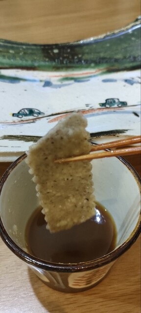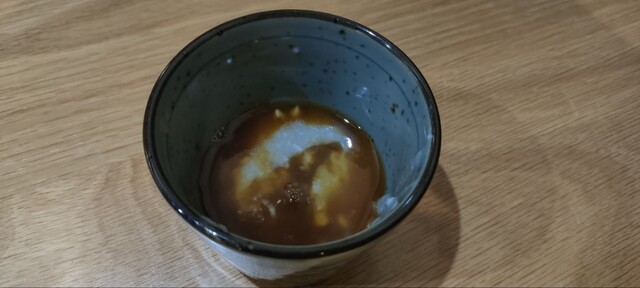 蕎麦湯はお粥のようにドロドロ。今まで見た蕎麦湯で一番濃いと思う。蕎麦湯を蕎麦の実が入った器に入れ、つけ汁を入れて飲む。美味い。