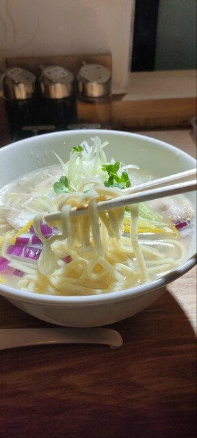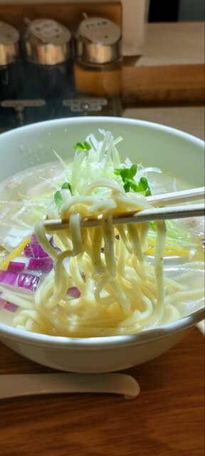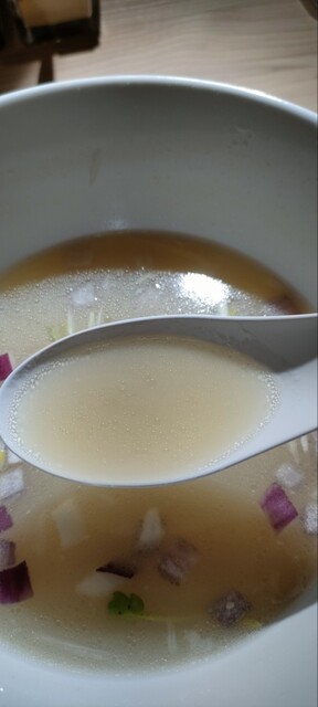 麺の上には、薄くて大きいチャーシューが2枚、大きい支那竹、生玉ねぎ、カイワレ、柚子が載る。