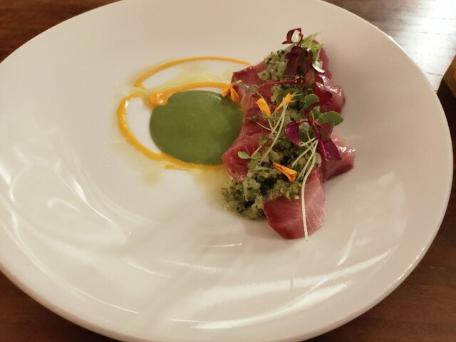 表面はキャラメリゼでほろ苦く、ナッツとフルーツたっぷりの柔らかい生地はチーズ強め。バルサミコソースで軽さをプラス。ペロリと頂きました。