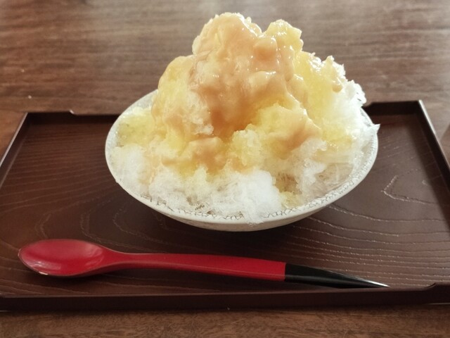 〆のかき氷、マンゴーと練乳と酒粕のソース