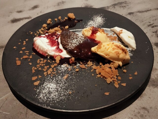 チョコソースが忍ばせてあるオムレツに温かいヴァンショーソースと冷たいアイス。肌寒い夜にピッタリ。