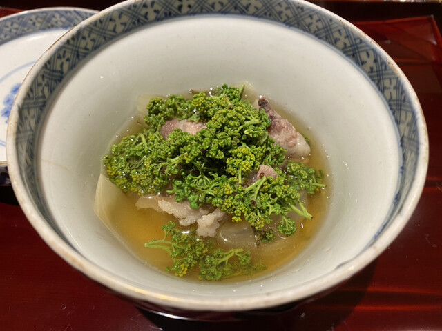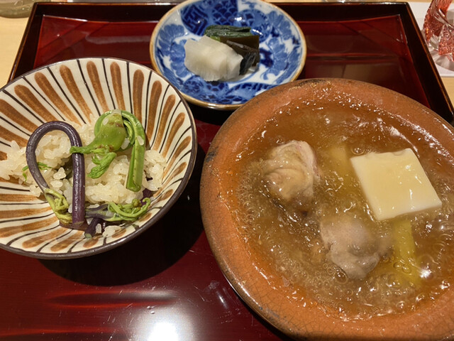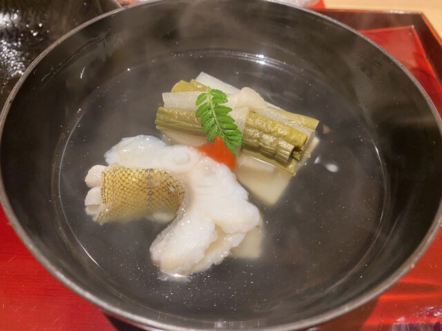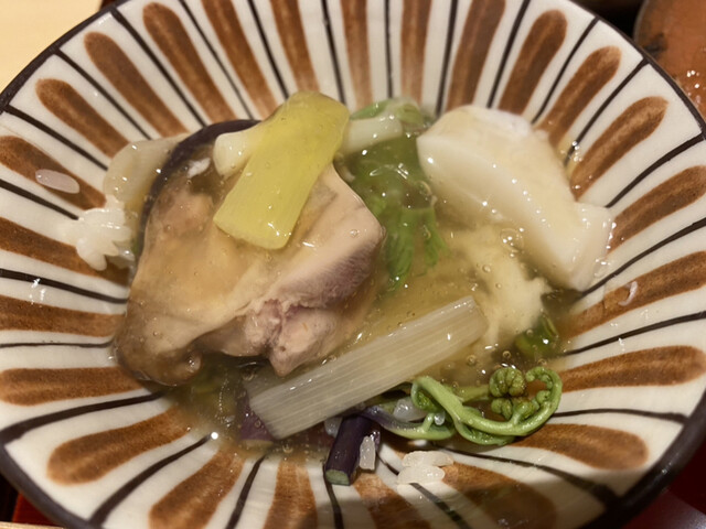 鱧と山菜などがかんぴょうで巻かれた梅肉の入ったお椀