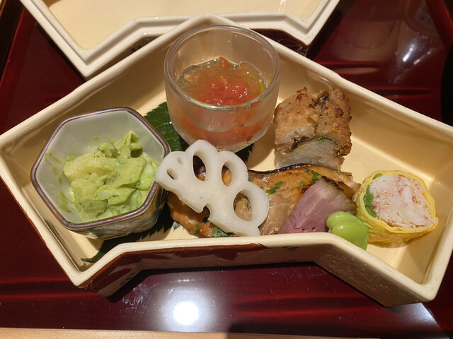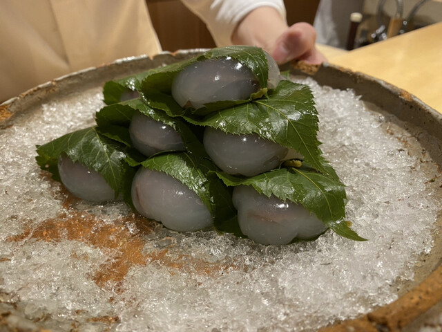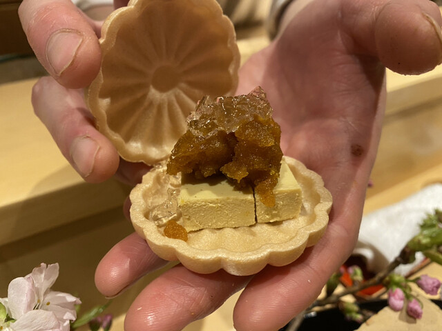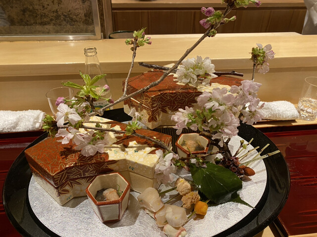 今まで和食で頂いていた八寸の中でダントツTOPな八寸でした。その場で桜を剪定して、1つ1つ作り上げて行くので、