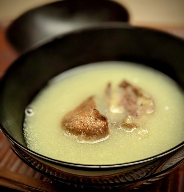 「銀杏の擦り流しに 栗の渋皮揚げのお椀」先ずはこれで、ドギモを抜かれました。 しっかりお出汁に、風味豊かな銀杏の擦り流し、そして甘く香ばしい揚げた渋皮栗・・・♡