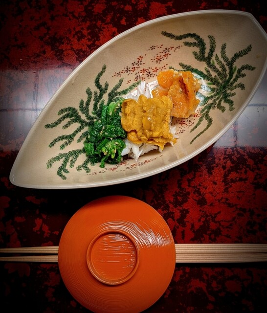 伊勢海老の焼き霜、海老味噌に加減酢