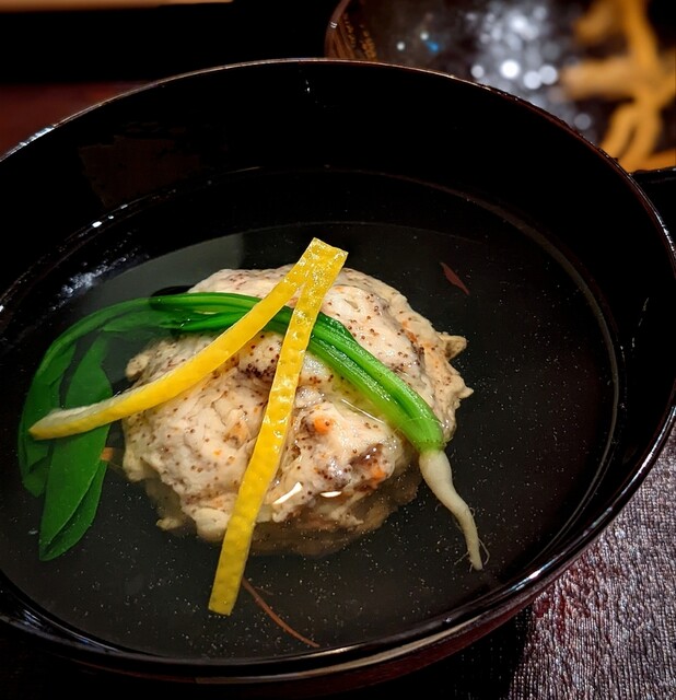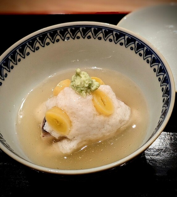 毛蟹真丈 冬瓜 毛蟹の出汁餡。毛蟹真丈はマンマ蟹の身。中に内子の塊もゴロリでした。蟹の甲羅で取った餡も雑味無くキレイ。それを吸った冬瓜がまた美味。