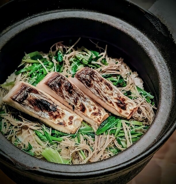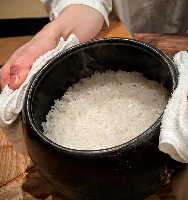 炊きたての土鍋ご飯、パチパチとお焦げに爆ぜる音が心地よく、薫りも最高。